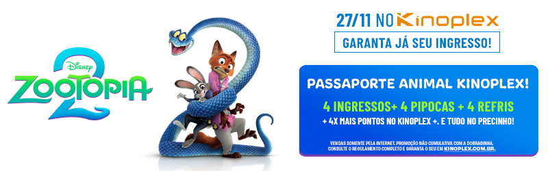 A oportunidade que você esperava para assistir ZOOTOPIA 2 com toda a família! Aproveite o Passaporte Animal para garantir a diversão completa: 4 ingressos + 4 combos + 4x mais pontos no Kinoplex+.